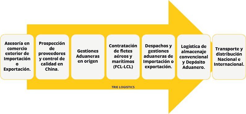 TRIE LOGISTICS is a Logistics Operator specialized in International Trade, capable of offering its clients, in a centralized manner and with a single interlocutor, the integral management of the logistics chain.